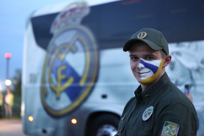 Участников финала Лиги Чемпионов УЕФА 2017/18 в киевских аэропортах встречали работники пограничной службы с раскрашенными в цвета футбольных клубов лицами.