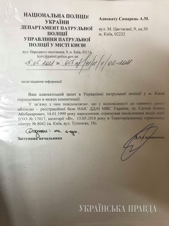 "Саитов Ахмед-Абубакарович, водитель Мерседеса (АА 0095 ТТ), получил водительские права через 16 дней после инцидента с Мустафой. То есть на момент инцидента он не имел этих прав", - отметил Маси Найем.