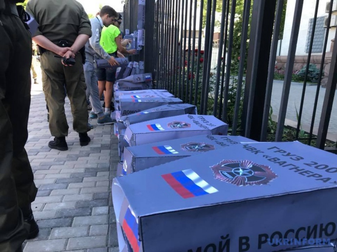 Как сообщает Укринформ, несколько десятков активистов принесли под дипломатическое представительство символические картонные гробы с надписью "Груз 200 ЧВК "Вагнера".