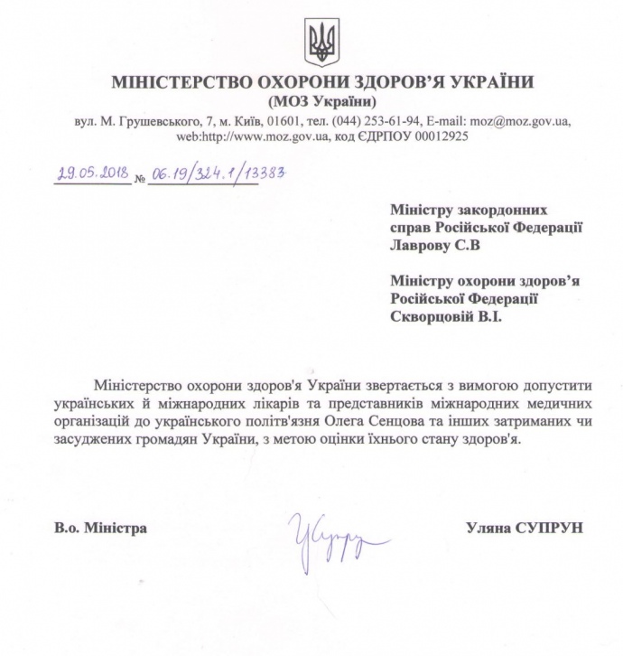 "Министерство здравоохранения Украины обращается с требованием допустить украинских и международных врачей и представителей международных медицинских организаций к украинскому политзаключенному Олегу Сенцову и другим задержанным или осужденным гражданам Украины, с целью оценки их состояния здоровья", - говорится в письме.