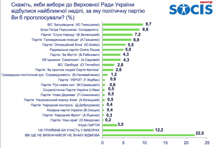 В тройке "лидеров" также недавно созданная "Слуга Народа" актера Владимира Зеленского, поддержка которой составила 7,2%.