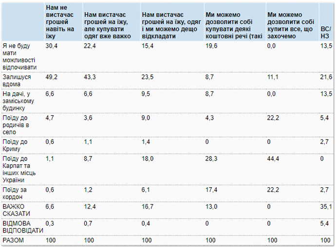 Отмечается, что количество тех, кто не поедет отдыхать, обратно пропорциональна уровню финансовой обеспеченности: чем ниже доход, тем больше тех, кто не поедет отдыхать и наоборот.