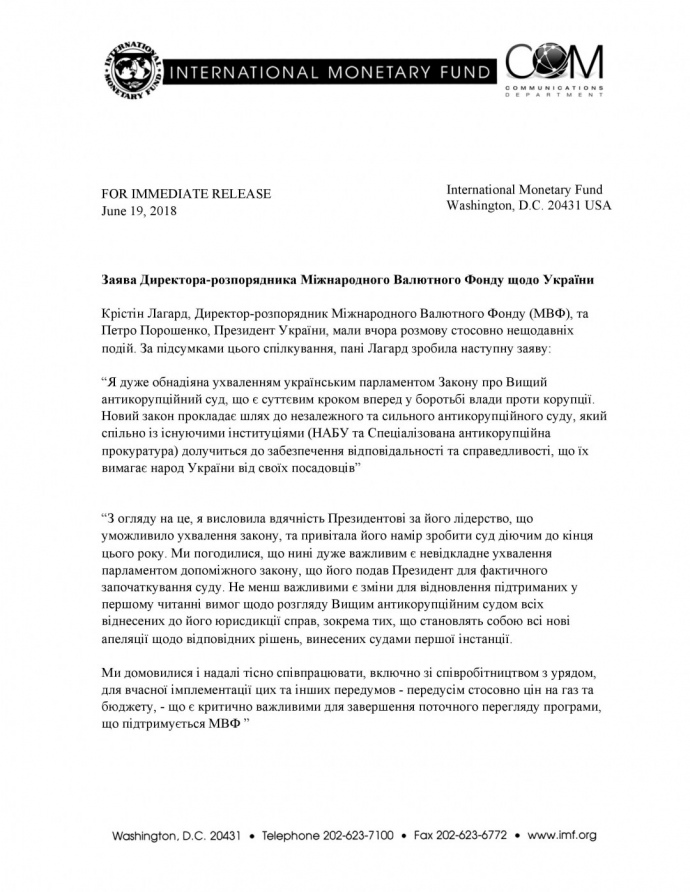 "Мы согласились с тем, что сейчас важно, чтобы парламент быстро принял президентский законопроект для формального создания суда, а также необходимые поправки для восстановления требования о том, чтобы суд рассматривал все дела, которые находятся в его юрисдикции, включая апелляции на решения судов первой инстанции , как это было в проекте закона, одобренном в первом чтении", - заявила директор-распорядитель Международного валютного фонда Кристин Лагард.