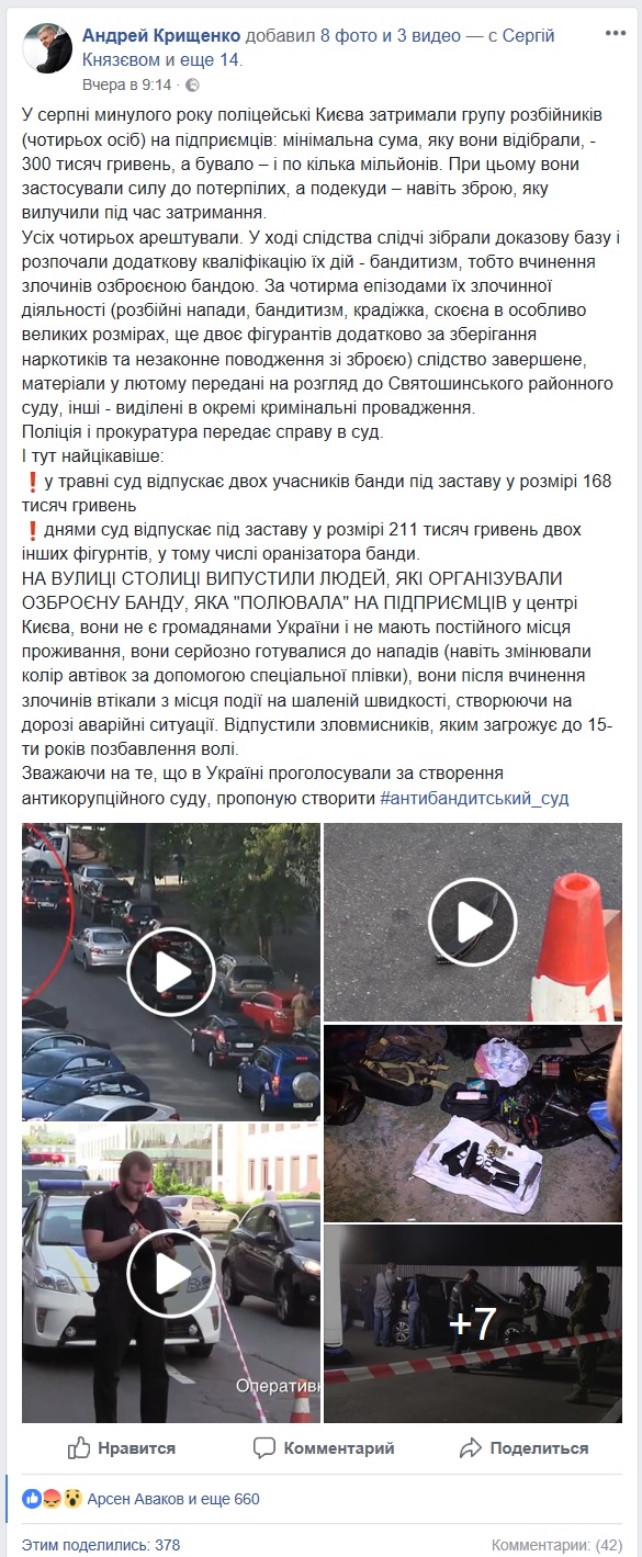 20 июня начальник киевской милиции Андрей Крищенко написал, что Святошинский райсуд Киева отпустил под залоги четверых бандитов, которые отбирали деньги у предпринимателей.