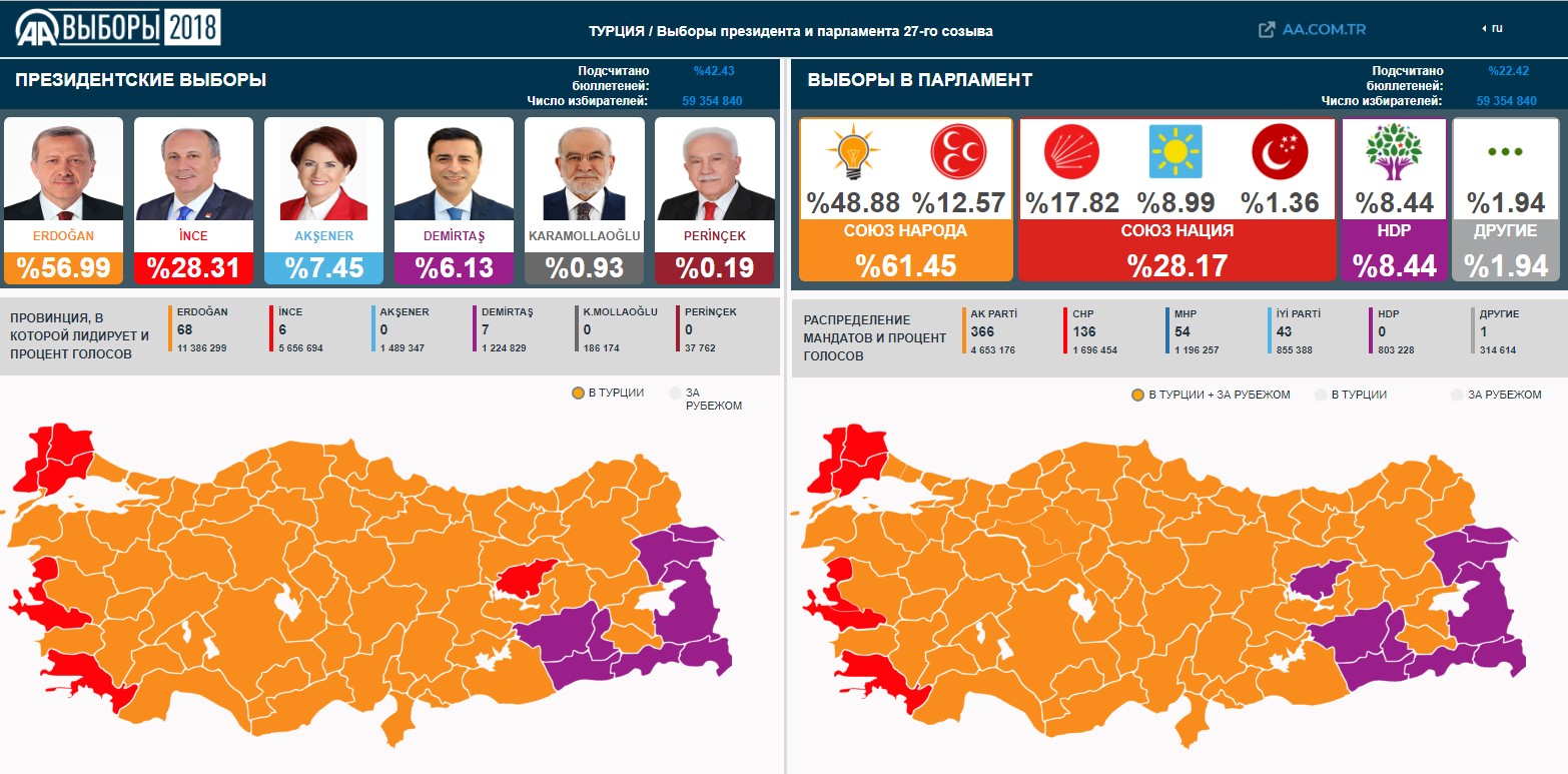 Кроме президентских в Турции проходят и парламентские выборы, на которых также пока лидирует партия Эрдогана "АК" (Союз народа) с более 61% голосов. Оппозиционнеры из "Союза Нации" набирают чуть более 28%, сообщает "Анадолу".