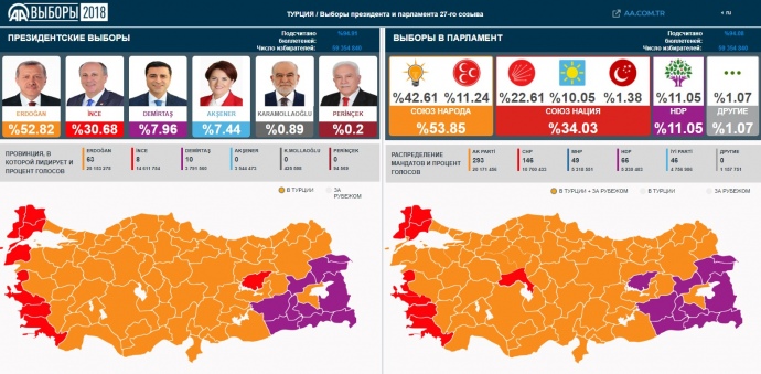 По состоянию на 22:00 после подсчета около 95% бюллетеней, на выборах президента Турции лидирует Эрдоган с 52,83% голосов, оппозиционный кандидат Индже набирает 30,68%.