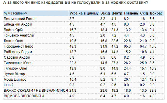 Второе место заняли бы Анатолий Гриценко (12,6%), Олег Ляшко (10,7%) и Юрий Бойко (10,2%), а третье – Петр Порошенко (8,5%), Владимир Зеленский (8,3%), Вадим Рабинович (7,5%) и Святослав Вакарчук (7,4%).