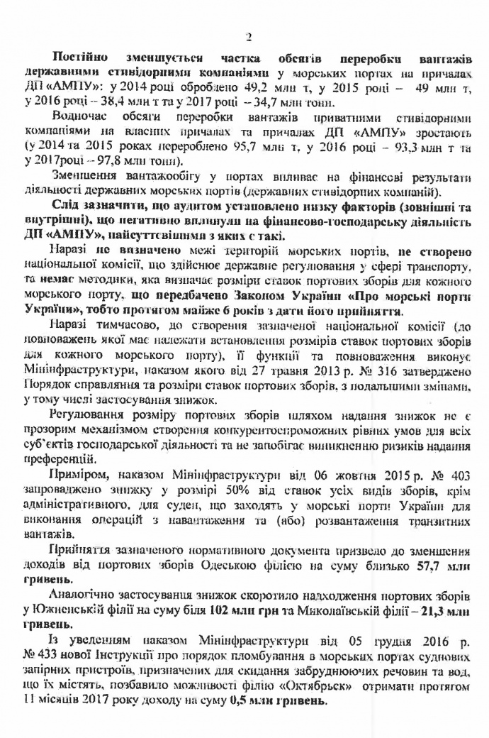 А из-за того, что Николаевский филиал в июле 2013 года заключил договора сервитута (ограниченного права пользования землей - ред.) на заведомо невыгодных условиях в период с 1 января 2016 года по 1 декабря 2017 года утрачена возможность взыскания с операторов средств за доступ к причалам на сумму 195 млн грн.