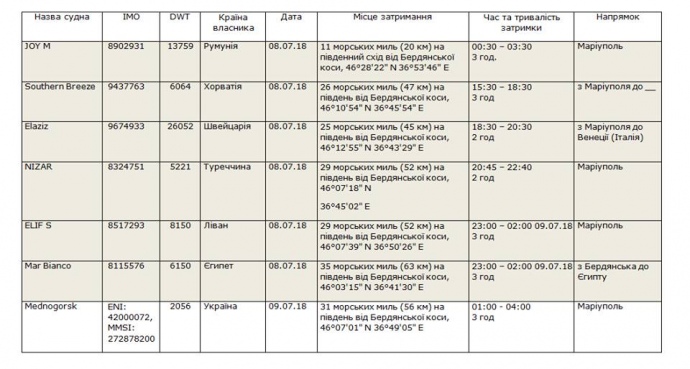 "8 июля с 00:30 до 23:00 катера береговой охраны пограничной службы ФСБ РФ перехватили 6 (шесть) судов, идущих к/с Бердянску или Мариуполю (район перехвата отмечен на Карте 1 желтым маркером). Еще одно судно было перехвачено около 1:00 в ночь на 09.07.18 в том же районе", - написал он.