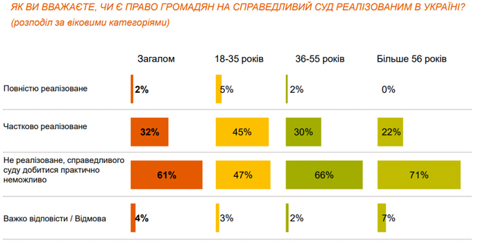 Большинство украинцев считают, что право на справедливый суд не является реализованным в Украине и не доверяют судам, даже новому Верховному суду.