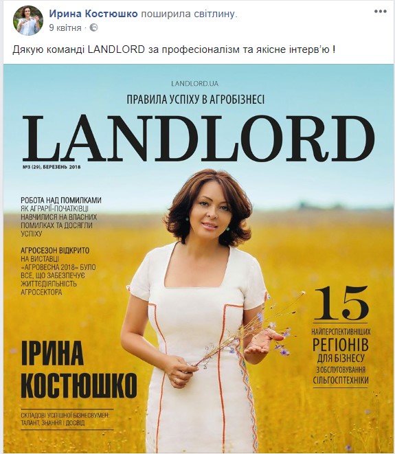 "В Житомирском облсовете Ирина Костюшко - глава земельной комиссии, она занимается льноводством на Коростенщине. В 2017 году взяла в эмфитевзис земельные участки в своем избирательном округе площадью почти 20 га и вывела мужа на третью позицию в ТОП-5 крупнейших землевладельцев Киевсовета", - отмечают журналисты.