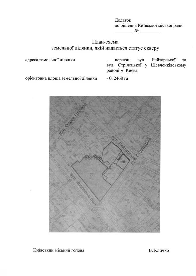 Отмечается, что для сквера в КГГА выбрали участок площадью 0,2468 га на пересечении ул. Рейтарской и ул. Стрелецкой.