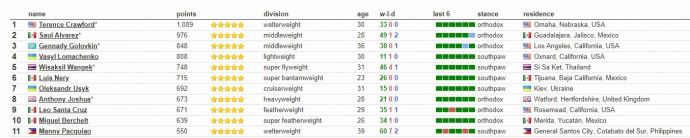Усик занимает 7 место, имея в активе 692 очка, пишет SportArena. В этом же рейтинге 4 место занимает украинец Василий Ломаченко c 808 очками.