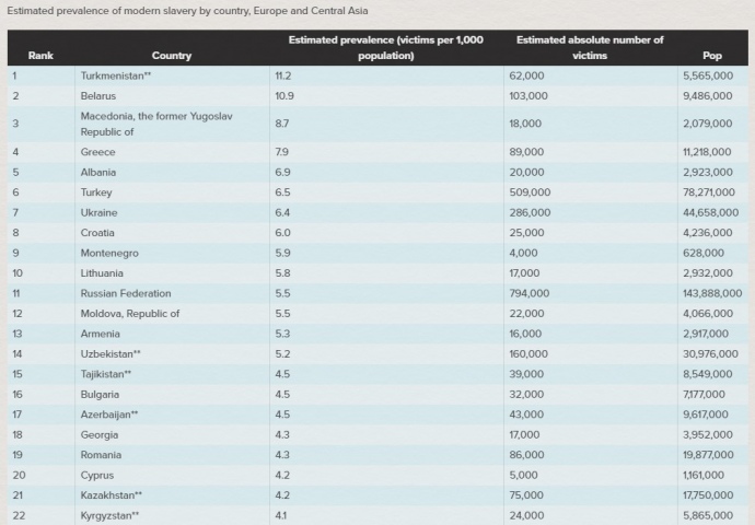 При этом Туркменистан, Беларусь и Македония признаны странами с высоким распространением современного рабства, а Россия, Турция и Украина имеют самый высокий абсолютный показатель в 39% жертв в регионе Европы и Центральной Азии.