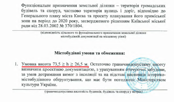 Согласно ГУО, условная высота здания составит от 26,5 до 73,5 м. При этом согласно Генплану Киева в центральном историческом ареале, куда входит и Подол, высота зданий должна быть не выше 27 м.