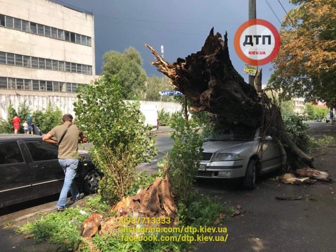 25 июля в результате непогоды в Киеве ряд деревьев упали на дороги, автомобили и даже дома, пострадали машины и от падения рекламных щитов.