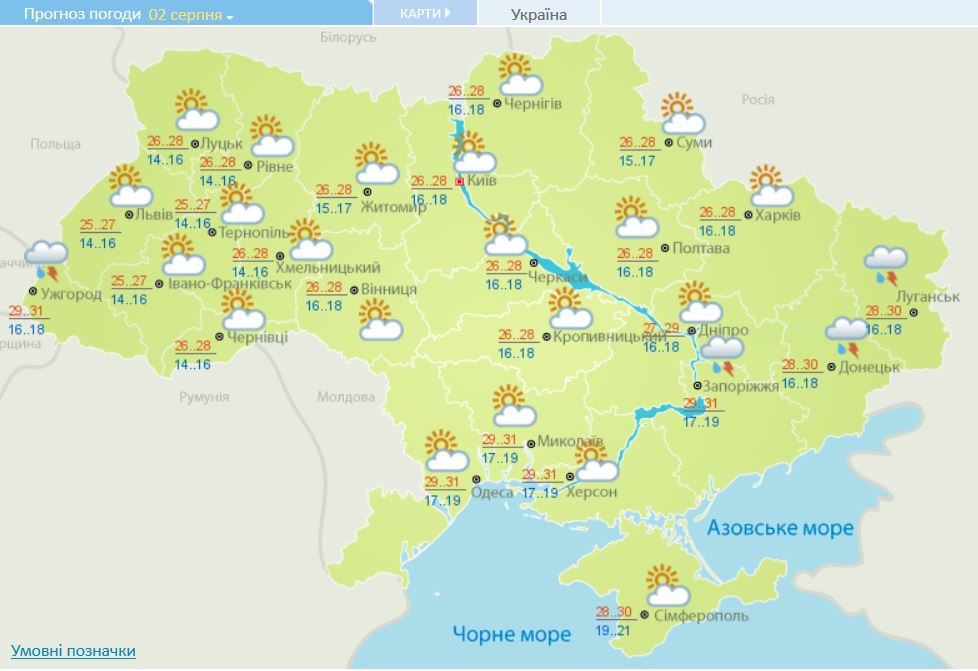 В четверг, 2 августа, - без осадков, лишь в восточных, Запорожской и Закарпатской областях местами кратковременный дождь, гроза. Ветер преимущественно северо-восточный, 5-10 м/с, на юге и востоке страны местами порывы 15-20 м/с.