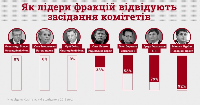 Лидеры трех фракций Верховной Рады фактически проигнорировали работу в комитетах и не посещали их заседания за время работы восьмой сессии (февраль-июль 2018).