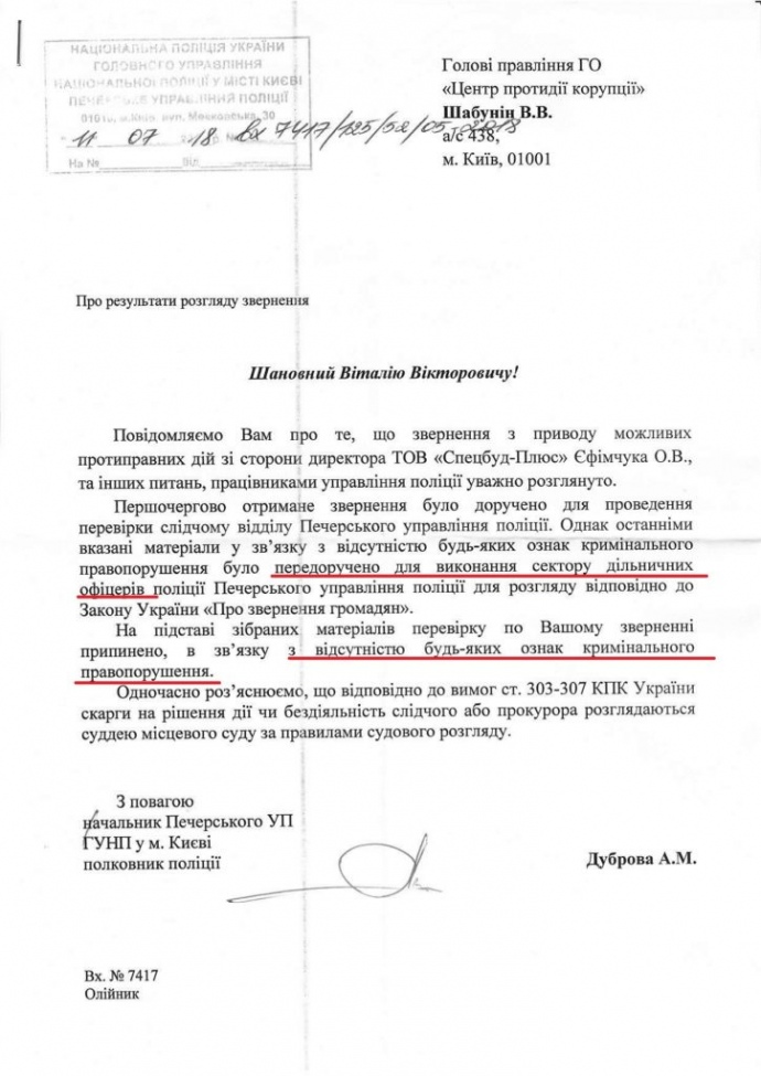"На основании собранных материалов проверку по Вашему обращению прекращено, в связи с отсутствием каких-либо признаков уголовного преступления", - говорится в ответе.