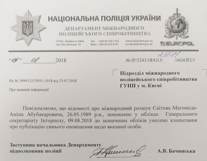 Сарган обнародовала ответы на запросы от Нацполиции, Департамента международного полицейского сотрудничества Нацполиции Украины, а также фото синей карточки Интерпола, где указано, что Саитова Магомеда-Амина Абубакаровича ищет Интерпол.