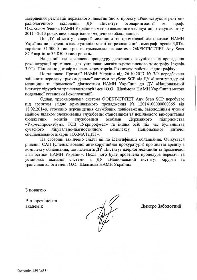 Однако аппаратура находится под арестом в криминальном производстве от 2014 года. Расследование идет относительно растраты бюджетных средств должностными лицами государственного предприятия "Укрмедпроектбуд" и частной фирмы ООО "Укрпрофмед" во время строительства детской больницы "Охматдет".
