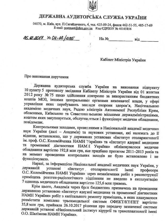 Держаудитслужба провела проверки в учреждениях Национальной медицинской академии наук: Институте отоларингологии имени проф. А.С. Коломийченко и Институте ядерной медицины и лучевой диагностики.