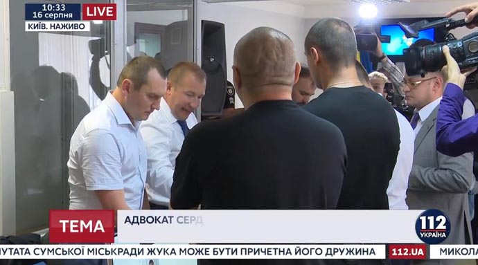 Во время перерыва в коридоре суда случилась потасовка между мужчиной, который представился "начальником Оболонской полиции" и Сердюком.