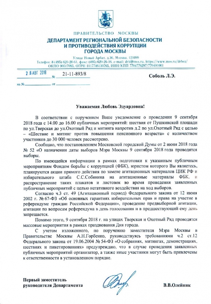 Оппозиционерам напомнили, что 9 сентября в Москве проводятся выборы мэра, а также массовые мероприятия на указанных улицах в рамках празднования Дня города.