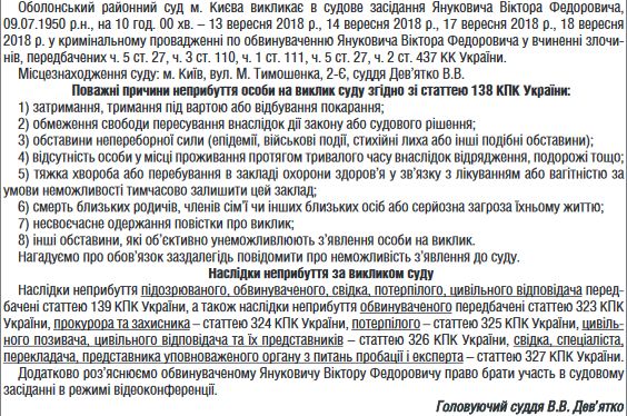 "Дополнительно разъясняем обвиняемому Януковичу Виктору Федоровичу право участвовать в судебном заседании в режиме видеоконференции", – говорится в объявлении без уточнений.