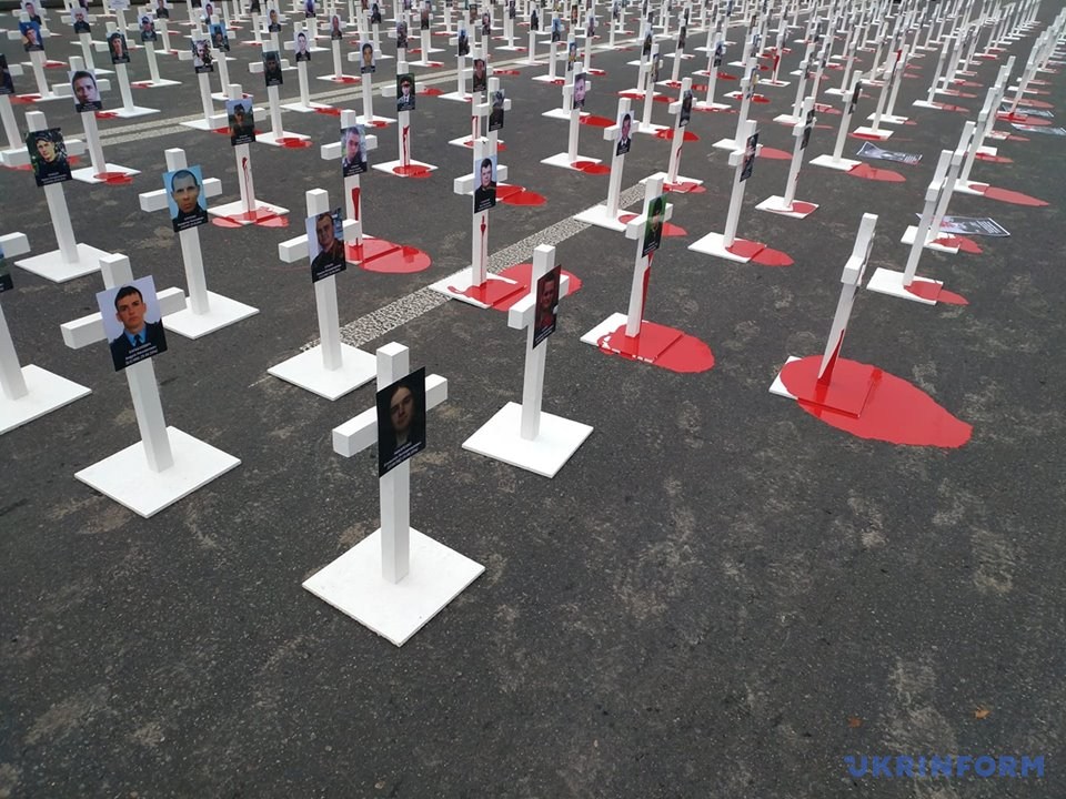 Под посольством Российской Федерации в Киеве активисты провели акцию "Путин, за Иловайск ответишь" и установили на проезжей части 366 белых крестов в память о жертвах Иловайской трагедии.