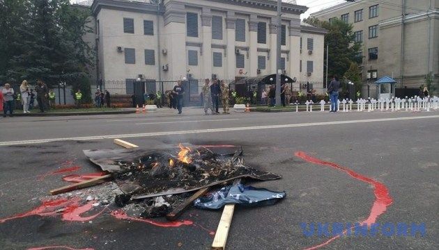 Организаторы акции попытались передать обращение к Путину с требованием освободить всех украинских политзаключенных, однако работники посольства через голосовую связь у входа заявление принять отказались и порекомендовали направить обращение почтой на адрес посольства.