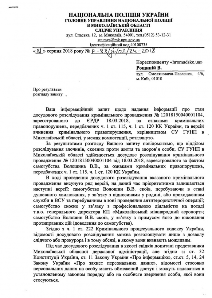 Полиция Николаева рассматривает три основные версии самоубийства военного летчика и бывшего и.о. директора Николаевского аэропорта Владислава Волошина.