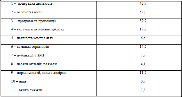 Среди факторов, которые больше всего влияют на выбор кандидата, наиболее весомыми были признаны: личные качества кандидата (57%), предварительная деятельность (43%) и программа и предложения (40%).
