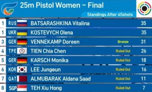 Ранее Костевич завоевала бронзу в команде-миксте с Олегом Омельчуком в стрельбе из пистолета на дистанции 10 м.