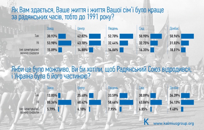 Каждый четвертый в целом в Украине (25%) и каждый третий на Донбассе в частности (36%) хотели бы, чтобы Советский Союз возродился, и Украина была его частью, а 68% и 51%, соответственно, не хотели бы, чтобы это произошло.