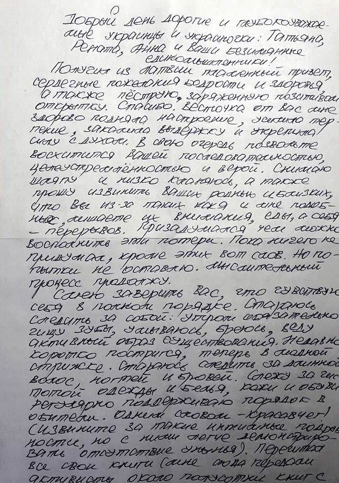 "Из пакетов с 1,5-литровыми пластиковыми бутылками сделал гантели - размахиваю перед собой. Зарядка помогла округлиться в отдельных местах, появился живой мышечный тонус, исчезла вялость в конечностях и плохие мысли. Что очень радует, особенно утром с первыми солнечными лучами. Неспешно готовлю себя к длительному путешествию и изменениям обстановки (этапированию к месту отбывания срока - ред.)", - пишет Сущенко.
