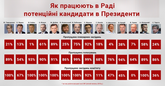 Отмечается, что Мураев пропустил без уважительных причин 92% пленарных заседаний ВРУ, Добкин – 89%, Рабинович – 75%, Вилкул – 61%, Билецкий – 58%, Куприй – 38%, Новинский – 25%, Тарута – 24%, Тимошенко – 21%, Каплин – 18%, Ляшко – 13%, Чумак – 7%, Шевченко – 4%, Бойко – 1%.