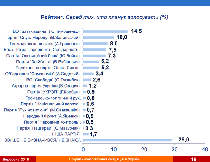 14,5%, среди тех, что пойдут на выборы, готовы проголосовать за ВО "Батькивщина", 10% за "Слугу народа", 8% – за Гражданскую позицию, 7,5% – за БПП, 7,3% – за Оппоблок.
