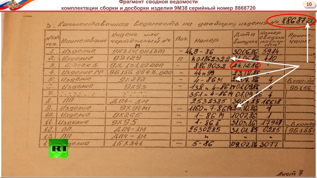 В своих выводах российские военные использовали данные расследования JIT и, в частности, серийный номер двигателя ракеты — 8869032, который вместе с остатками корпуса голландцы предъявили в мае 2018 года на своей презентации под Утрехтом.