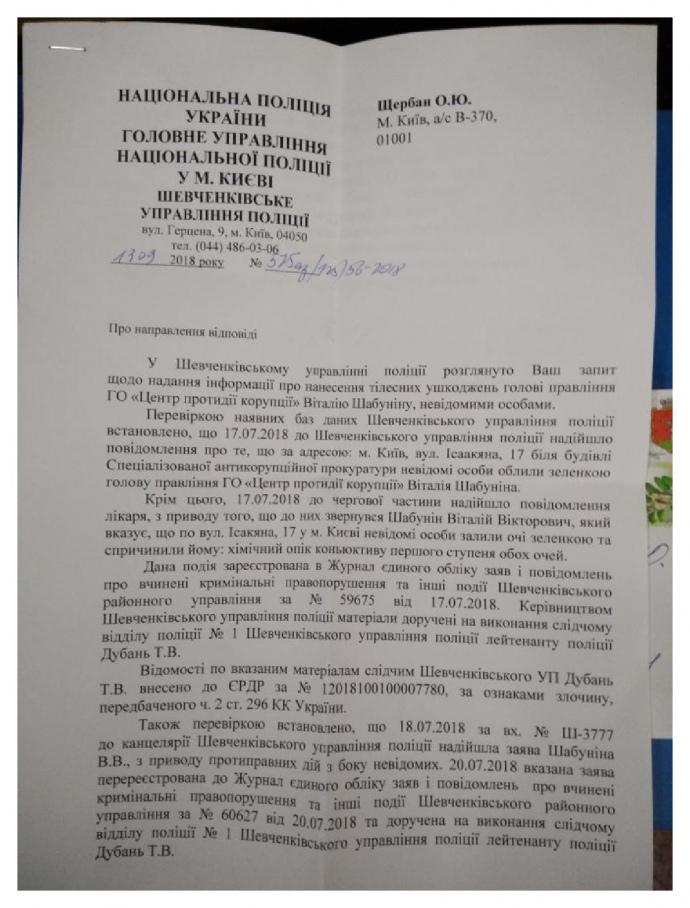 "В Нацполиции солгали о сложении админпротоколов на нападающих, которые облили председателя правления ЦПК Виталия Шабунина зеленкой в июле во время акции под САП", – утверждают активисты.