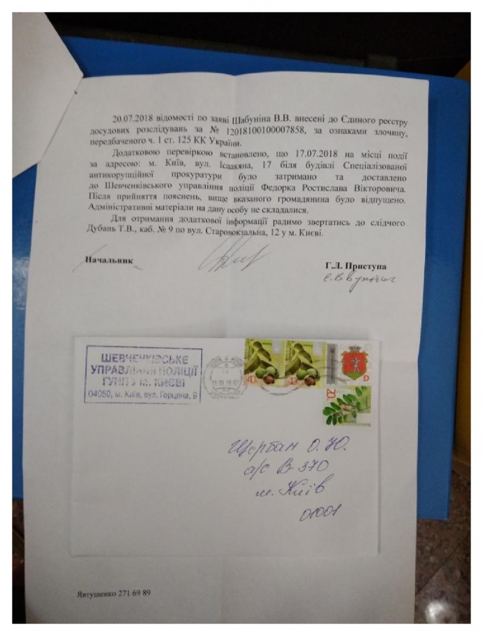 В нем говорится, что 17 июля у здания Специализированной антикоррупционной прокуратуры был задержан и доставлен в Шевченковское управление полиции Федорко Ростислав Викторович.