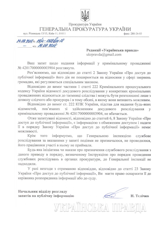 Об этом говорится в ответе ГПУ на запрос Украинской правды.