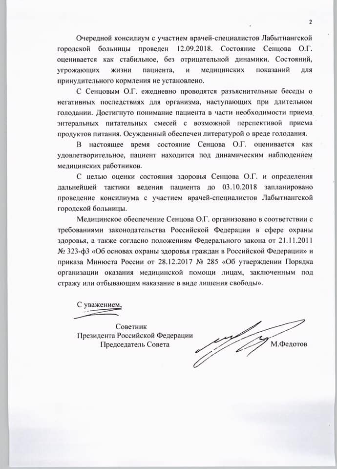 По ее словам, она получила ответ от председателя Совета при президенте РФ по развитию гражданского общества и правам человека Михаила Федотова, который сообщил о состоянии здоровья Олега Сенцова.