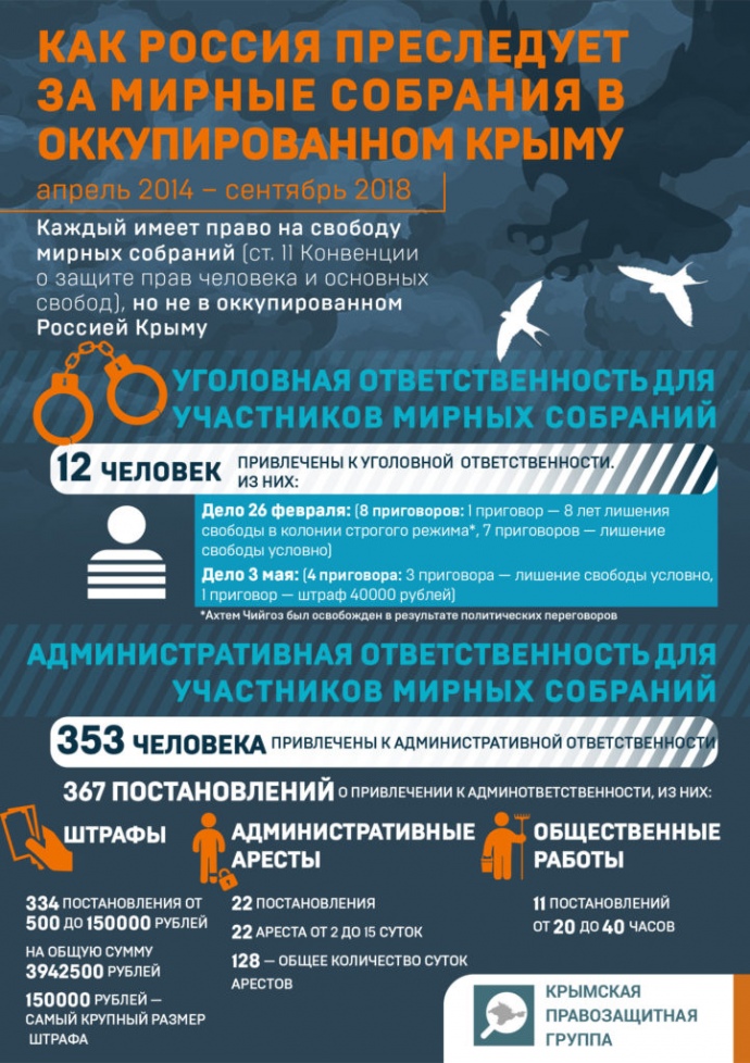 "Оккупационные власти значительно усилили ограничение свободы мирных собраний на территории Крымского полуострова, незаконно используя для этого репрессивное российское законодательство... Преследуя людей за участие в мирных собраниях, российские власти нарушают ст. 10 и 11 Европейской конвенции по правам человека, гарантирующие свободу выражения мнения и мирных собраний", - заявили правозащитники.