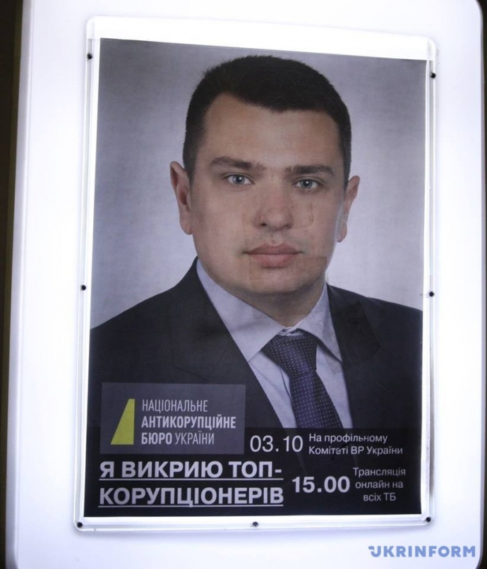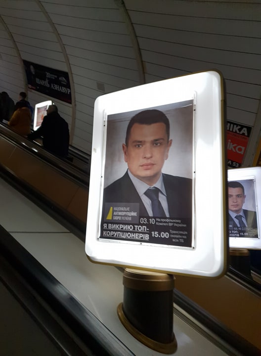 В частности, утром 1 октября на ситилайтах столичного метрополитена разместили изображение Сытника с надписью: "Я разоблачу топ-коррупционеров".