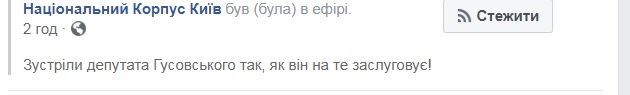 "Сегодня утром в холле КГГА неизвестные активисты облили зеленкой и забросали яйцами депутата Киевсовета Сергея Гусовского. Инцидент произошел в присутствии активистов Нацкорпуса, которые хотели задать ему вопрос о его коррупционной деятельности. Наши активисты участия в "люстрации зеленкой" не брали, считаем, что надо действовать другими методами", – заявил Нацкорпус.