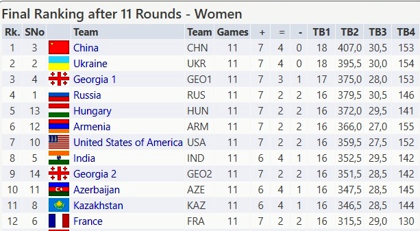 Кубок Гаприндашвили (суммарные показатели мужской и женской сборных) достался сборной Китая. Вторая – Россия, третья – Украина.