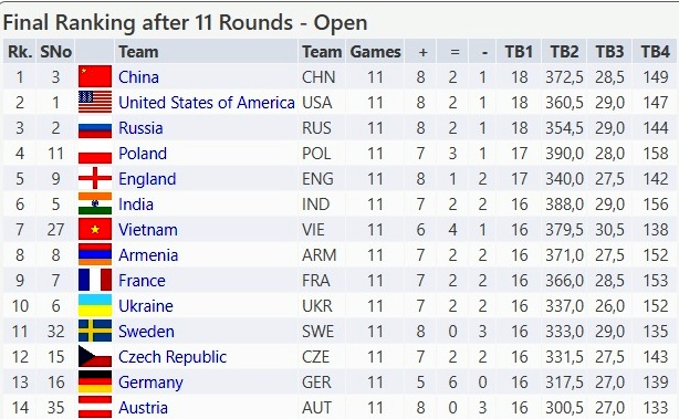 Победителем 43-й Шахматной Олимпиады стала сборная Китая. На втором месте – команда США, на третьем – сборная России.