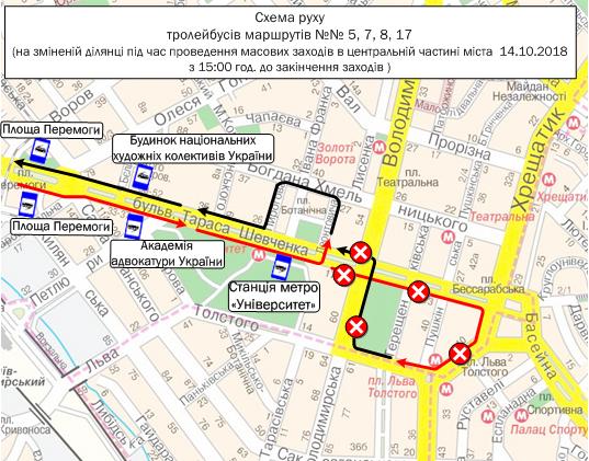 14 октября с 15:00 в связи с проведением массовых мероприятий в центральной части города и соответствующим запретом движения всех видов транспорта на ул. Владимирской (на участке от ул. Льва Толстого до бульвара Тараса Шевченко), б-ре Тараса Шевченко (на участке от ул. Владимирской до Бессарабской площади), ул. Крещатик (на участке от Бессарабской площади до Европейской площади), Европейской площади вносятся изменения в работу наземного общественного транспорта.