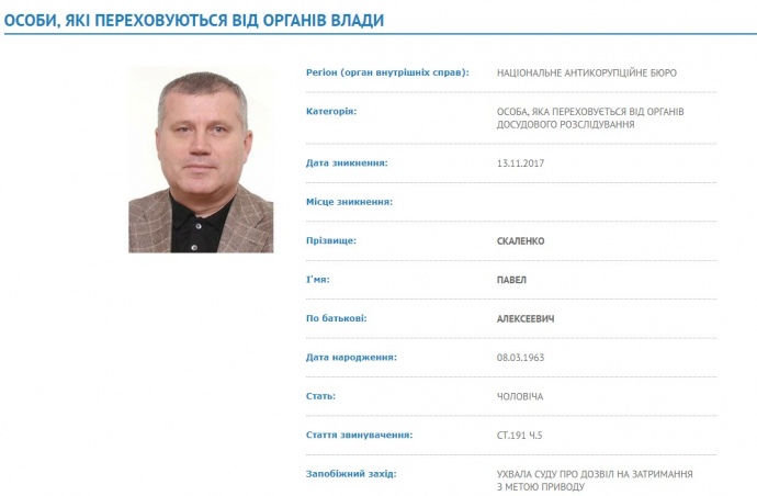"Действия подозреваемого квалифицируются по ч.5 ст.27, ч.5 ст.191 Уголовного кодекса Украины ("пособничество в завладении организованной группой чужим имуществом путем злоупотребления служебным лицом своим служебным положением, совершенного в особо крупном размере"). Указанному лицу сообщено о подозрение и он объявлен в розыск в ноябре 2017 года", - сообщили в НАБУ.